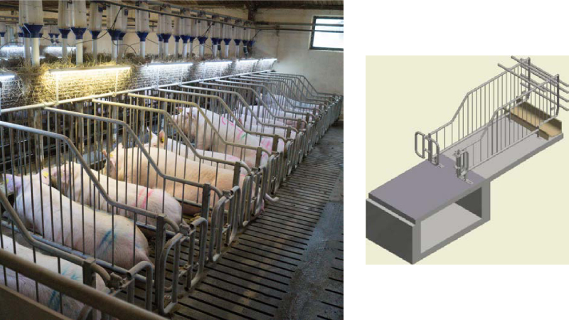 Установка системы с передней калиткой без передней трубы не позволяет хряку использовать переднюю трубу как лестницу, при этом предотвращая травмирование хряка и нанесения ущерба системе кормления. Установка передней калитки с проходом позволяет технику проходить не сгибаясь через стойло, что позволяет значительно облегчить процесс работы.