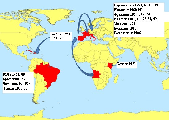 Первые вспышки «новой» АЧС среди домашних свиней были зарегистрированы в 1903 году в ЮАР. До середины 20-го столетия вспышки регистрировались только на Африканском континенте с периодичностью 2-4 года и преимущественно в ее южных регионах. В 1957 году был зарегистрирован первый очаг АЧС в Португалии, недалеко от Лиссабона, где вспышка африканской чумы вызвала гибель около 100% свиней. Три года спустя африканская чума распространилась по всему Пиренейскому полуостров, и неблагополучной страной кроме Португалии оказалась также Испания. Ликвидация АЧС в Испании и Португалии продолжалась на протяжении более чем 30 лет. Португалия была объявлена благополучной страной по АЧС в 1994, а Испания в 1995 году. За это время вспышки АЧС регистрировались в других странах Европы и странах Центральной и Южной Америки (рис. 6). Также в 1977 году вспышки АЧС были зарегистрированы на территории СССР в Одесской области и Молдавии, где было уничтожено все поголовье свиней в радиусе 30 км от очагов. С 1995 по 2007 год, если не считать случай АЧС, зарегистрированный в Сардинии (Португалия) в 1999 году, АЧС поражала свиней только стран Африканского континента: Зимбабве, Мозамбик, Нигерия, Ангола, Намибия, Кения, Того, Бенине, Эфиопия, ЮАР и др.