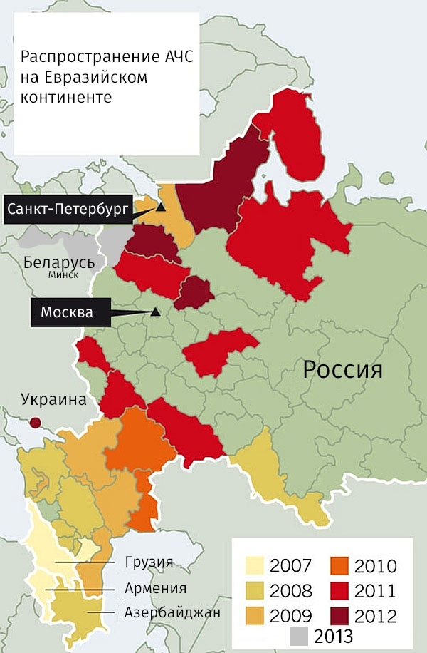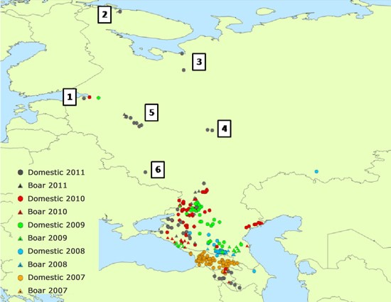 Распространение африканской чумы свиней от Кавказа до северо-западной части России создает тревожную ситуацию для Европы, в особенности после того, как возбудитель АЧС выявлен в 2012 году у диких кабанов Запорожья, а в 2013 году в Смоленской области и зафиксированы случаи в Беларуси в Гродненской и Витебской областях.