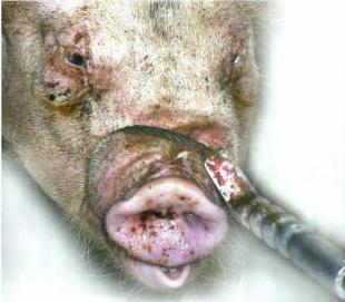 При клиническом осмотре поголовья свиней было установлено, что около 15% подсвинков существенно недобирали до средней массы тела, характерной для данной технологической группы, в группе откорма это число выросло до 30%. Максимальная разница в живой массе между откормочниками одинакового возраста достигала 35 кг. При более детальном осмотре у некоторых подсвинков и, главным образом, у свиней на откорме были обнаружены изменения, типичные для атрофического ринита (рис.1). Дальнейшие исследования свиней показали, что процент животных с наличием типичных изменений для атрофического ринита находится в пределах 5-10%, несмотря на то, что они были вакцинированы против указанной инфекции.