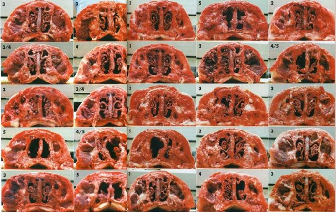 Морфометрические исследования показали, что из 25 произвольно отобранных свиней на убой двадцать (80%) имели разной интенсивности патологические изменения в носовых пазухах, указывающие на атрофический ринит (от 3 до 5 баллов по шкале, рис.2).