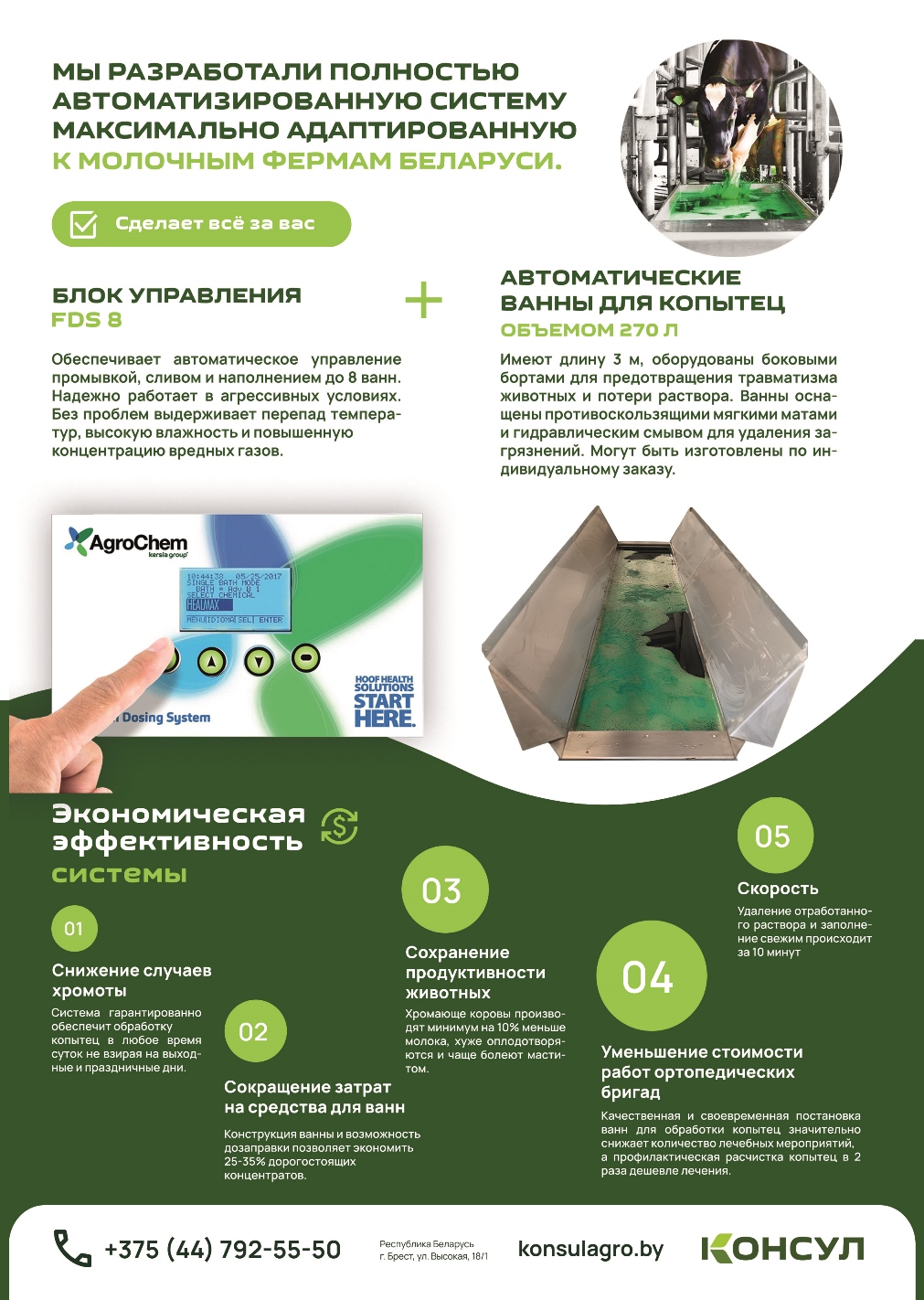 Система состоит из блока управления (автоматизированная дозирующая система) и автоматических ванн для копытец 270 л. Система полностью автономна (исключает участие человека), безопасна для животных. Система заменяет традиционный ручной процесс добавления воды и химических продуктов в копытные ванны. Система предназначена, для одновременного управления промывкой, сливом и наполнением до 8 ванн; позволяет независимо программировать каждую копытную ванну.