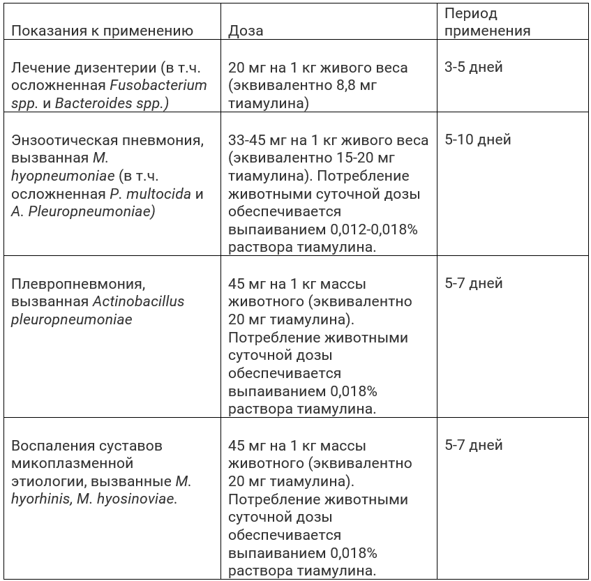 Индейкам препарат применяют в дозе 0.056-0.11 г. на 1 кг. массы птицы, что соответствует 25-50 мг/кг. тиамулина.