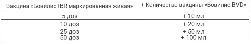 Внутримышечно применяют однократную дозу (2 мл) вакцины «Бовилис BVD», смешанной с вакциной «Бовилис IBR маркированная живая».