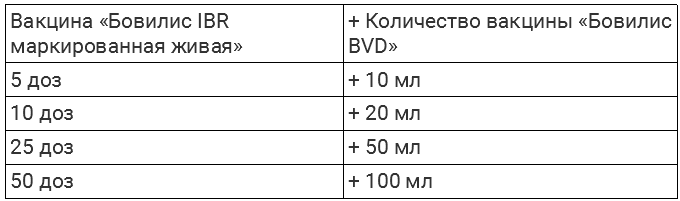 - через 6 месяцев после первичной вакцинации (или повторной при ранней защите). Последующие ревакцинации с интервалом не более 12 месяцев.Для ревакцинации возможно комбинированное использование данной вакцины с вакциной Бовилис BVD. Для этого вакцину «Бовилис IBR маркированная живая» растворяют вакциной Бовилис BVD B следующем соотношении: