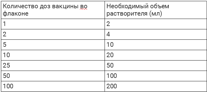 Перед использованием вакцину разводят растворителем «Унисольв» согласно указаниям таблицы: