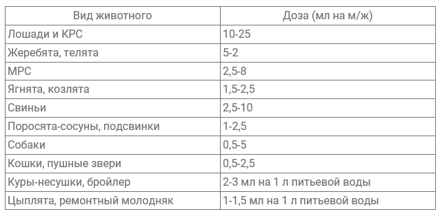 Препарат применяют КРС, МРС, лошадям, свиньям, собакам, кошкам и пушным зверям один раз в сути внутримышечно, подкожно или внутривенно (медленно), с/х птице – перорально с водой для поения в течении 4-5 дней подряд, разовых дозах, указанных в таблице: