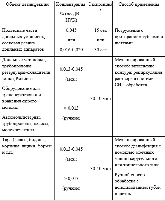 * Примечание: время воздействия зависит от концентрации средства, вида обрабатываемого объекта, протяженности трубопроводов, размеров объекта дезинфекции и его удаленности от моечной станции.