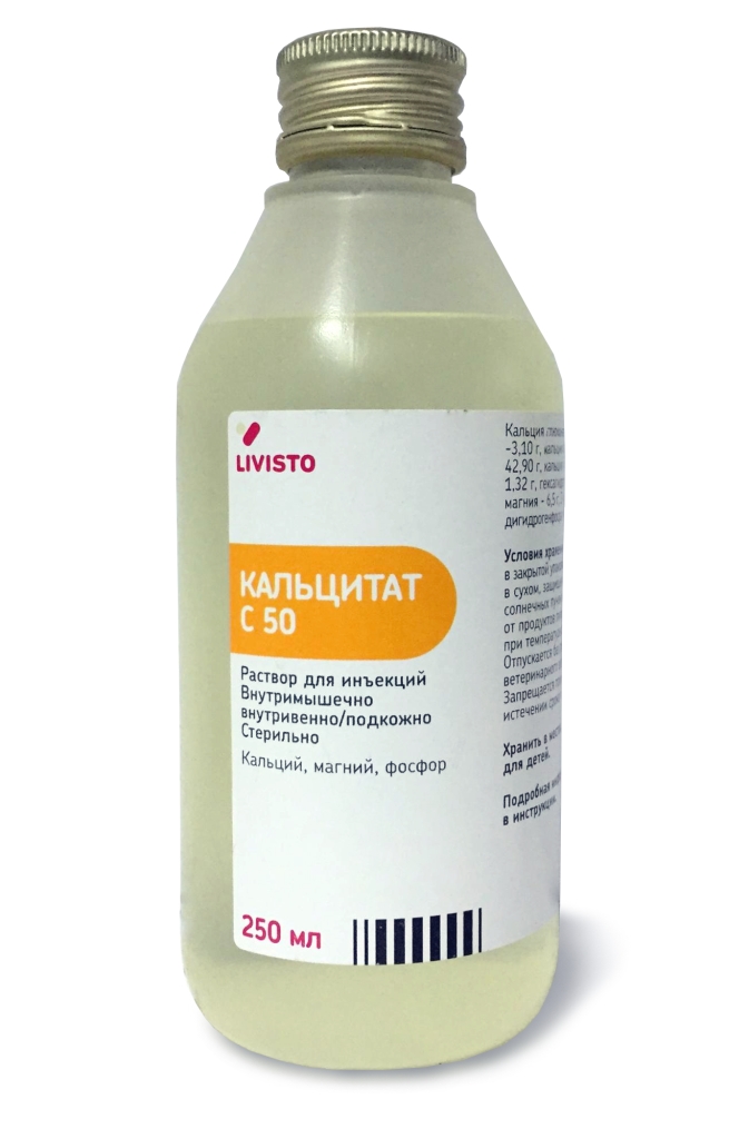 ⸰ МРС для лечения послеродовой гипокальциемии, при состояниях, сопровождающихся острым дефицитом кальция, нарушениях обмена кальция, фосфора и магния, в дозе — 15 мл/50 кг массы животного.