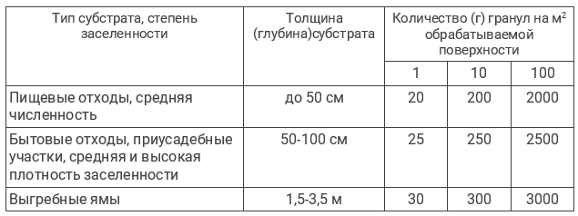 - При толщине слоя не более 50 см и низкой численности личинок расход средства составляет 20 г на 1 м2 поверхности.