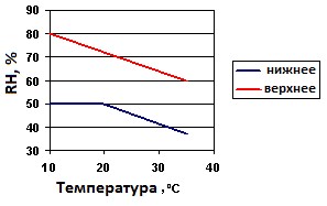 Рис. 1. Допустимое значение относительной влажности воздуха в помещении для свиней при различной температуре