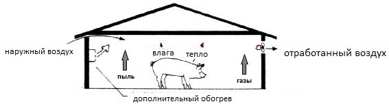 Как видно из определения задачи минимальной вентиляции, воздухом необходимо обеспечить не помещение, а животных, которые в нем содержатся. Следовательно, помимо количества приточного воздуха, немаловажным фактором является и траектория его движения.