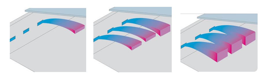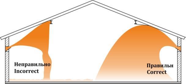Только при выполнении обоих условий приточный воздух будет иметь достаточную массу и скорость для того, чтобы, образовав поток вдоль потолка, достичь середины помещения и, перемешавшись с теплым воздухом, опуститься в зону обитания животных (рис. 3). При этом на потолке не должно находиться каких-либо элементов, препятствующих оптимальному распространению воздушного потока (рис. 5)