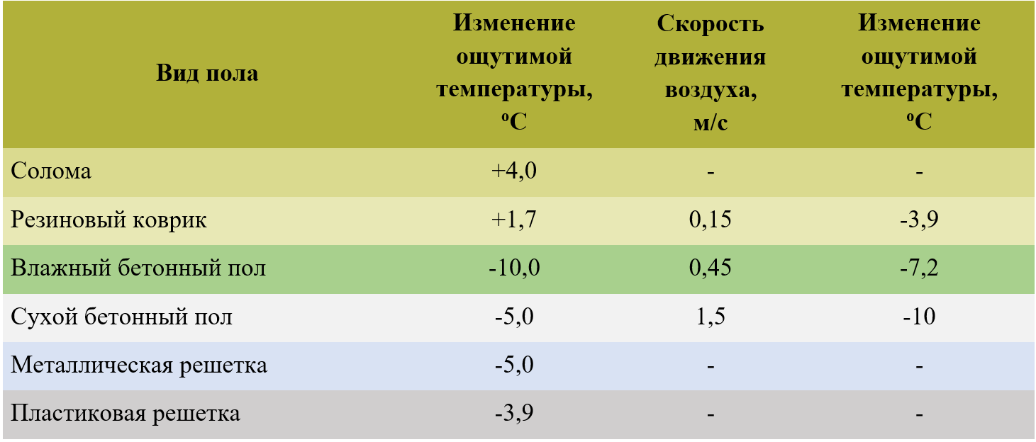 В начале статьи указывалось о необходимости учитывать температуру, ощущаемую свиньями, а не просто температуру воздуха, зафиксированную ртутным столбиком термометра. Влияние различных факторов на ощутимую температуру иллюстрирует таблица 4.