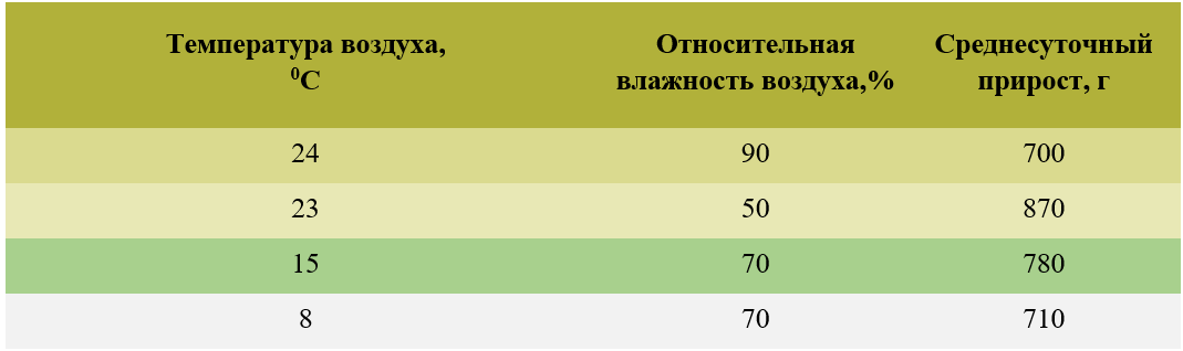 Таблица 5. Влияние температуры и относительной влажности на продуктивность свиней