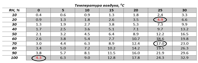 Таблица 6. Влагоемкость воздуха (кг/м3) при различной температуре и относительной влажности