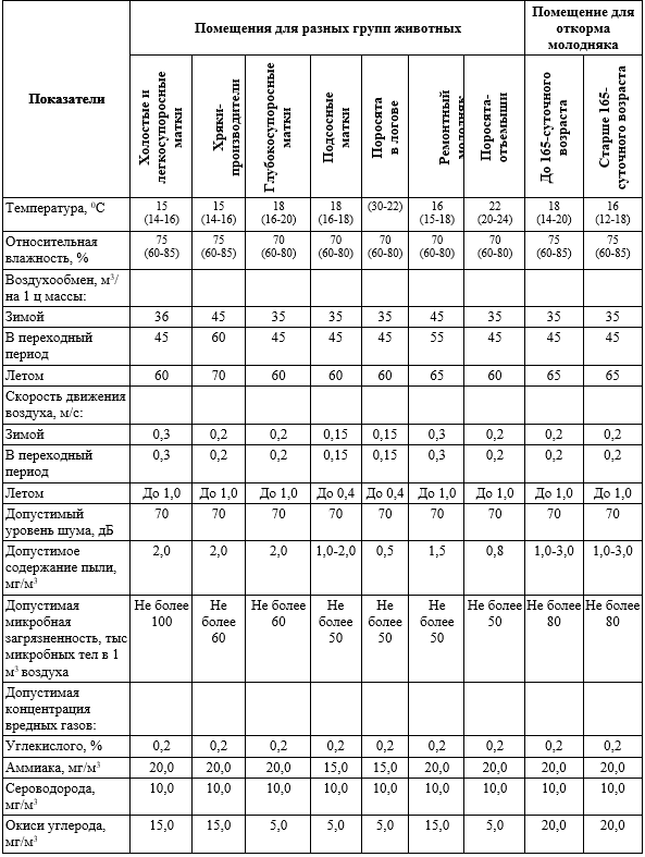 Таблица 7. Параметры микроклимата и воздухообмена помещений для свиней