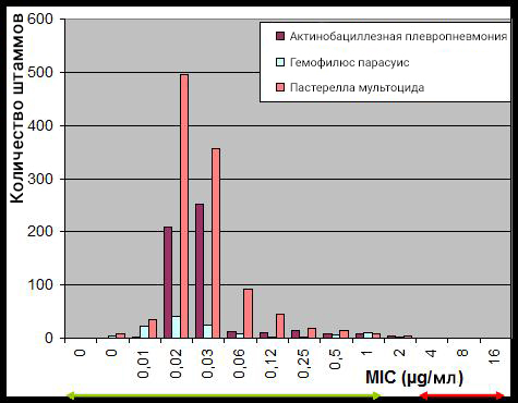 Марбофлоксацин в виде 2% раствора зарегистрирован для лечения КРБС (комплекс респираторных болезней свиней), вызванного чувствительными штаммами Pasteurella multocida, Арр и Mycoplasma hyopneumoniae. Чувствительность к марбофлоксацину этих патогенов и Haemophilus parasuis представлены на рис. 2.