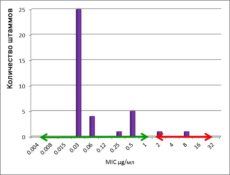 Рис. 3. Распределение MIC 16% марбофлоксацина в отношении штаммов E. coli, изолированных при ММА.