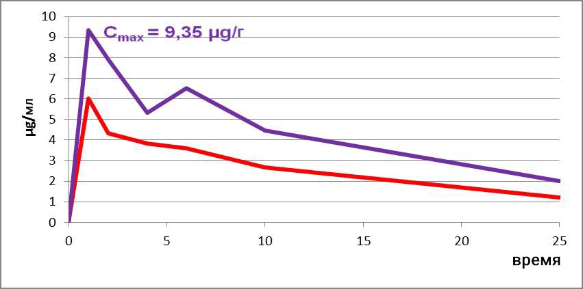 Рис. 4. Концентрация 16% марбофлоксацина в плазме крови (синяя линия) и тканях матки (красная линия) у свиноматок.