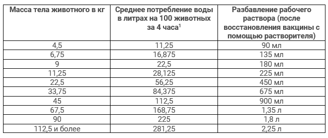 Установить дозатор на подачу 30 мл растворенной вакцины на каждые 3,75 л воды. При необходимости можно провести разбавление вакцины в соответствии с таблицей, используя чистый контейнер и необработанную каким-либо средствами воду.