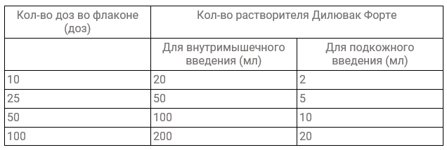 Вакцину восстанавливают (растворяют) из расчета 2 мл растворителя Дилювак Форте нa одну дозу при внутримышечной инъекции и 0,2 мл растворителя. Дилювак Форте на одну дозу при внутрикожной инъекции.