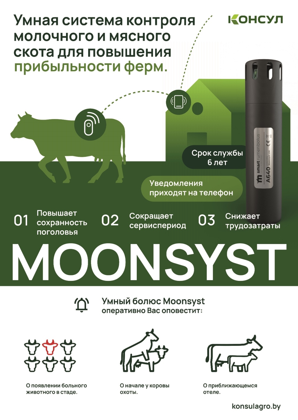 - о начале охоты у коровы, указывая специалистам оптимальный период осеменения животного, сокращая сервис период, что в конечном итоге приводит к увеличению продуктивности. Стандартные датчики активности, закрепленные на ноге или шее, теряются. А их стоимость достаточно высока. Болюс Moonsyst невозможно потерять. Он находится в рубце коровы и служит 6 лет и более.