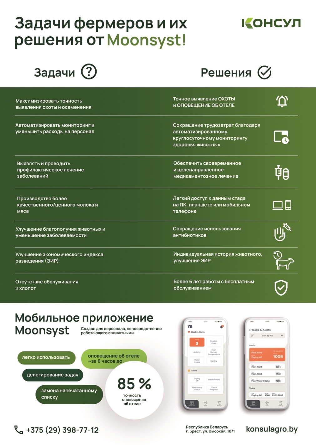 - о приближающемся отеле, точность 85%. Не редко отелы требуют акушерской помощи. Но даже после физиологически нормального отела требуется вовремя выдоить молозиво и выпоить теленка. Болюс Moonsyst заранее предупреждает о приближающемся отеле. Позволяет вовремя подготовить родильный бокс, перегнать туда корову, подготовить доильный аппарат для доения или разморозить молозиво из банка.