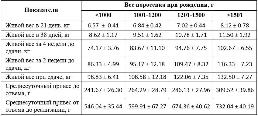 Таблица 1. Энергия роста поросят в зависимости от массы при рождении поросят