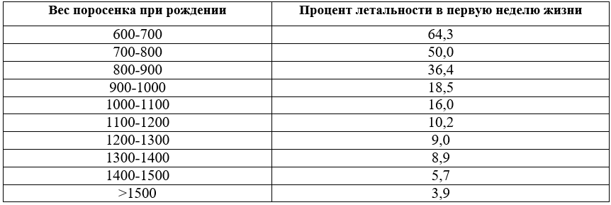 Таблица 2. Зависимость массы поросенка при рождении и летальности
