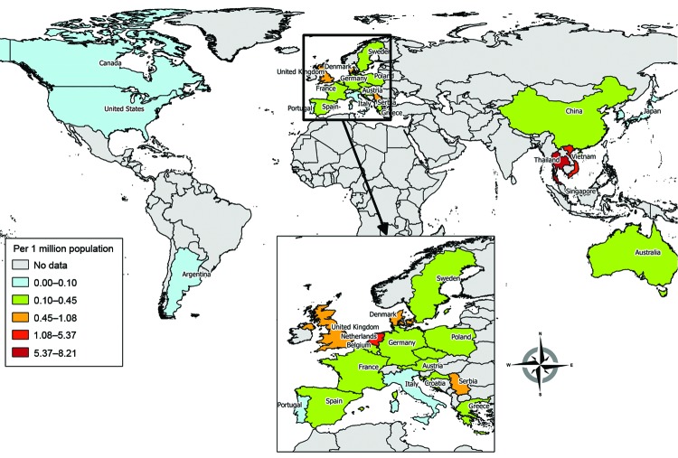 Стрептококкоз распространен более чем в 30 странах и, поскольку является антропозоонозом, вызывает также болезни у человека. К концу 2012 года в общей сложности было зарегистрировано 1584 случая заражения Streptococcus suis людей. Две большие вспышки эндемических заражений людей Str.suis 2 серотип (SS2), которые произошли в Китае в 1998 и 2005 годах, вызвали серьезную озабоченность в области здравоохранения и поставили под сомнение традиционное мнение, что инфекции SS2 человека могут быть только спорадическими (единичными).