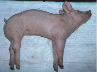 Восприимчивы животные от рождения до 8-недельного возраста. Чаще всего стрептококкоз регистрируется после отъема. Самый первый признак, как правило, лихорадка, которая может наблюдаться без других очевидных признаков и заканчиваться септицемией и внезапным падежом. В этот период, как правило, имеется перемежающая лихорадка, отсутствие аппетита, апатия. При подостром течении свиньи могут быть найдены мертвыми без каких-либо предвестников болезни. Менингит (Рис.4) является наиболее характерным признаком, на основании которого можно поставить предположительный диагноз.