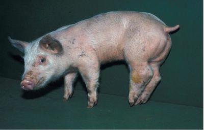 Свиньи на ранних стадиях менингита могут криво держать свою голову, может наблюдаться косоглазие. Другие ранние нервные признаки включают апатию, несогласованность движений, принятие необычных поз (например, поза сидячей собаки), вскоре болезнь прогрессирует, и животное не может стоять, лежит на боку, совершает плавательные движения, наблюдается опистотонус, конвульсии и нистагм. Опухшие суставы и хромота являются показателем полиартрита (Рис.5). Эндокардит также часто выявляется у взрослых поросят. При этом свиньи умирают внезапно или появляются признаки одышки, цианоза и гипотрофии.