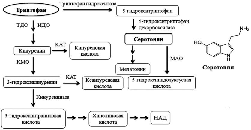 Триптофан необходим при синтезе медиаторов: серотонина и кинуренина (Рис.6). Серотонин – предшественник мелатонина, акцептора свободных радикалов (антиоксидант). Он необходим при синтезе острофазных белков и медиаторов воспаления. Замечено, что при заболеваниях легких наблюдается снижение концентрации триптофана в течение 10 дней. Это свидетельствует о необходимости этой аминокислоты в период респираторных болезней и вакцинаций от них.
